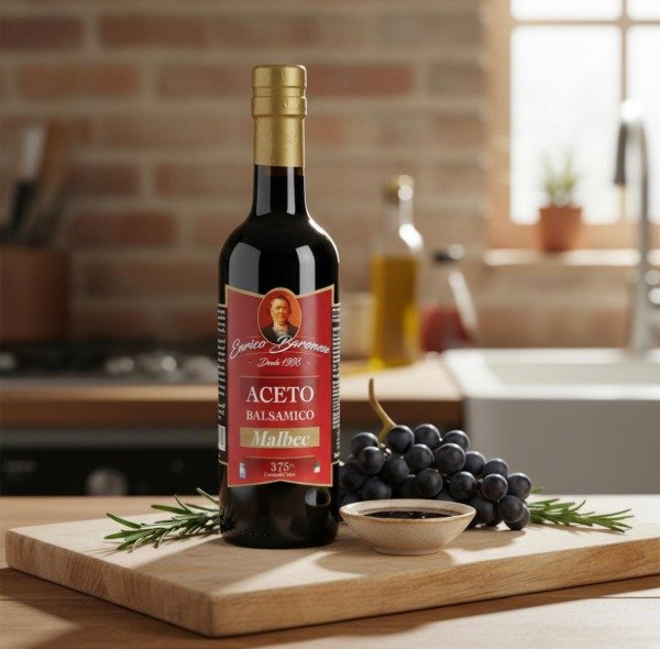 Ingredientes: mosto, vinagre de uva, vino malbec. Criado con el método artesanal italiano en toneles de roble.